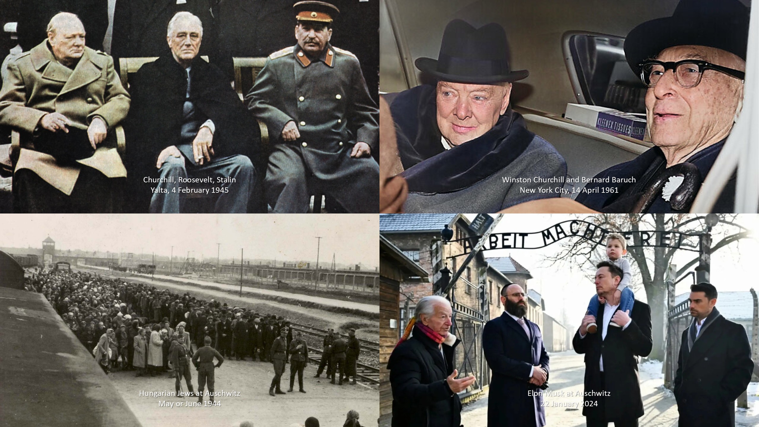 Yalta Conference (February 1945), Winston Churchill and Bernard Baruch in New York (April 1961), Arrival of Hungarian Jews at Auschwitz (June 1944), Elon Musk visiting Auschwitz (January 2024)