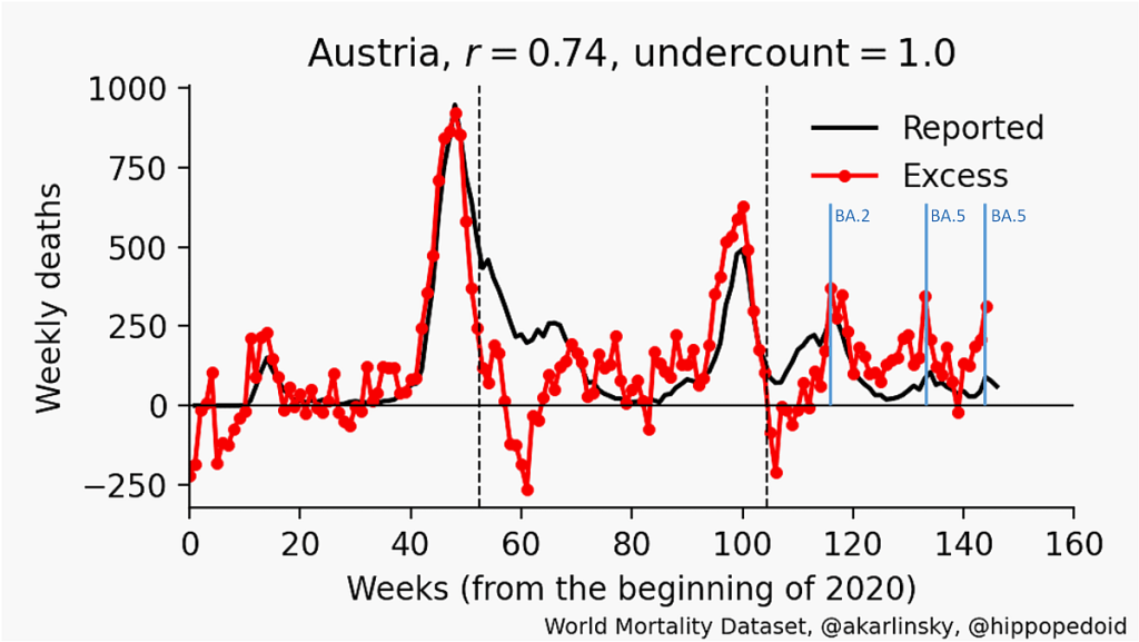 First of all, it is clear that peaks in excess mortality occurred in parallel to the four or even five large omicron waves in 2022, as shown in the chart below.