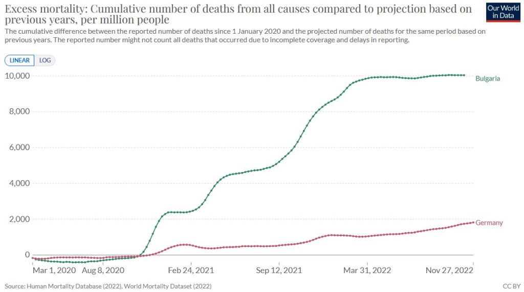Figure: Excess mortality in Bulgaria (low-vaccination) vs Germany (high-vaccination).