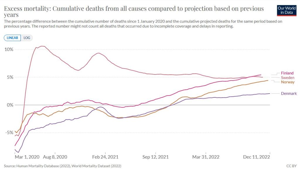 The same effect can be seen in Nordic countries: despite a very high vaccination and booster rate, Sweden saw no excess mortality in 2022, while its Nordic neighbors – Denmark, Norway and Finland – saw significant excess deaths in 2022 (see chart below).