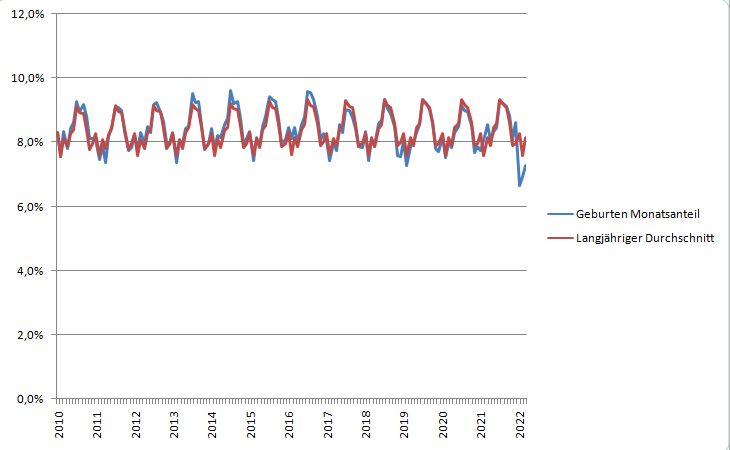 Germany: Monthly birth rate (2010-2022), expectation (red) and actual (blue)