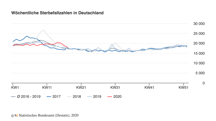 - German virologist Hendrik Streeck argues that Covid19 is unlikely to increase total mortality in Germany, which normally is around 2500 people per day. Streeck mentions the case of a 78-year-old man with preconditions who died of heart failure, subsequently tested positive for Covid19 and thus was included in the statistics of Covid19 deaths.
