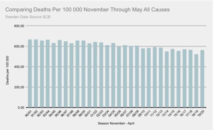 - Sweden: No lockdown, no masks, mortality comparable to strong flu wave.