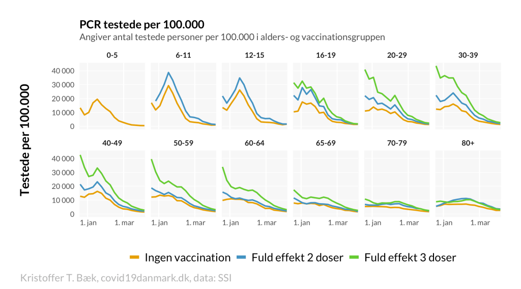 B) PCR test rates per vaccination status: Boosted people (green) and vaccinated people (blue) tend to test more than unvaccinated people (orange).