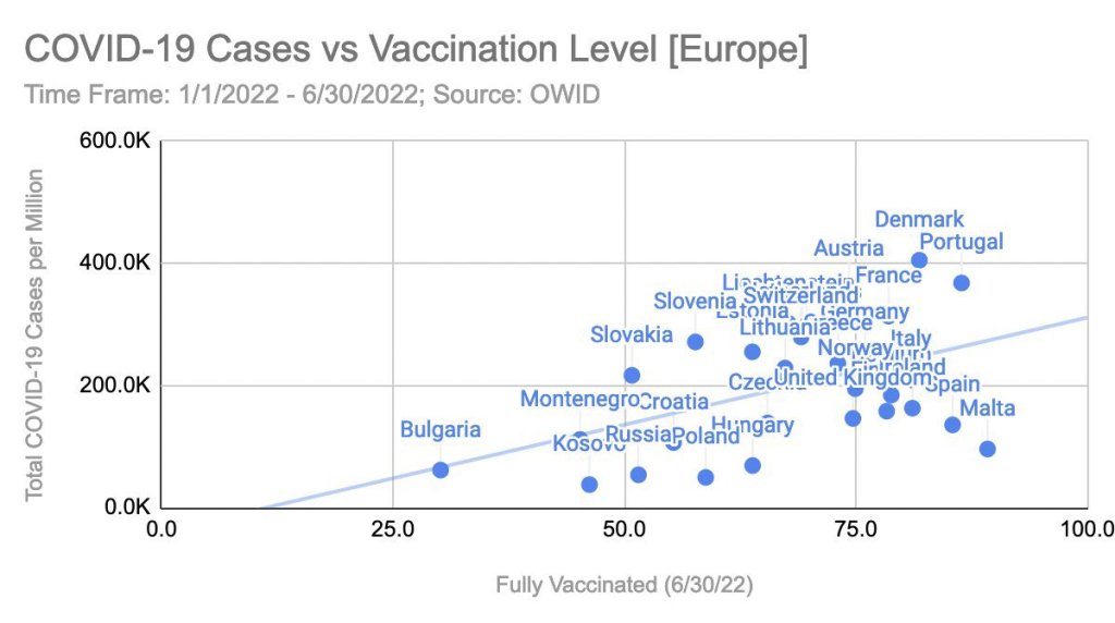 One year ago, in July 2021, some independent covid analysts noted that in Europe, countries with high covid vaccination rates had much higher covid infection rates than countries with low vaccination rates. They proposed that covid vaccinations might perhaps drive covid infections.