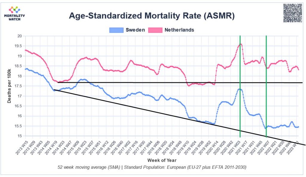 The Netherlands has a somewhat older population than Sweden (median age 43 vs. 41) and has had a flat mortality baseline since 2014. Using the correct mortality baselines, one can see that the overall pandemic excess mortality in the Netherlands and in Sweden was quite similar.