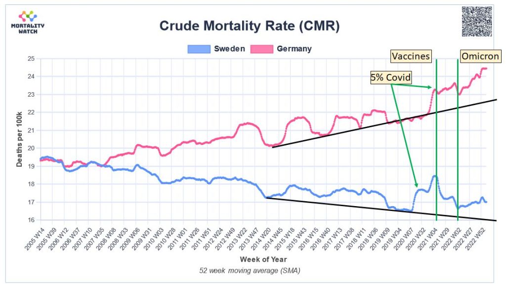 Everything is clearly visible: how Germany missed the first covid wave in the spring of 2020; how Sweden reached a 5% infection rate after the first wave, while Germany reached it only at the end of the year; how vaccination stabilized or even reduced covid mortality in 2021 despite three more covid waves; and how the milder omicron variant escaped vaccine protection in 2022.