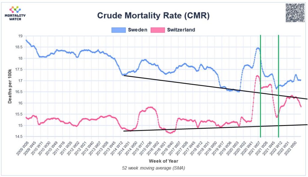 Switzerland has an even lower but slightly increasing mortality baseline compared to Sweden. Switzerland had a mild first wave in the spring of 2020, but a rather strong winter wave prior to vaccination. Vaccination reduced mortality in 2021 but omicron increased it again in 2022. The Swiss population is somewhat older than the Swedish population (median age 43 vs. 41).