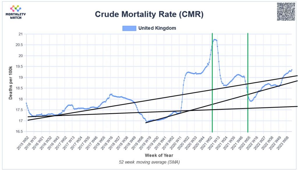 It is clear that British mortality has been increasing since 2010 and that a “five-year average” baseline, as initially provided by the British ONS, greatly overestimates true excess mortality: