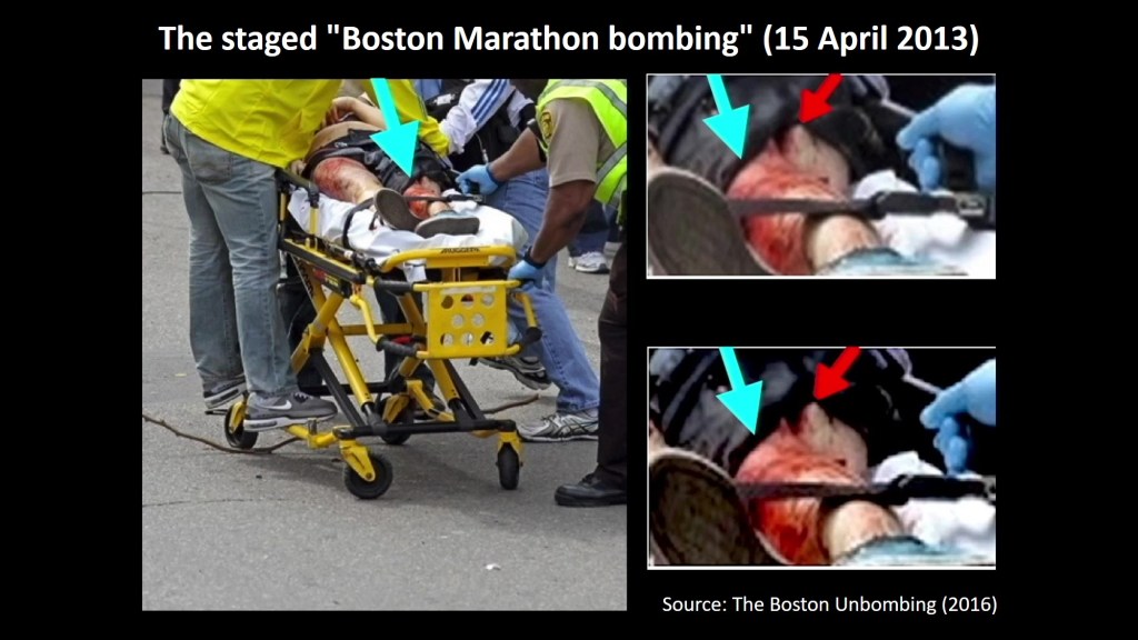 11 years ago today, the “Boston Marathon bombing” took place, a fully staged event involving two Hollywood-style smoke bombs, several civilian and military amputee actors, large amounts of stage blood, and photorealistic silicone simulation wounds.